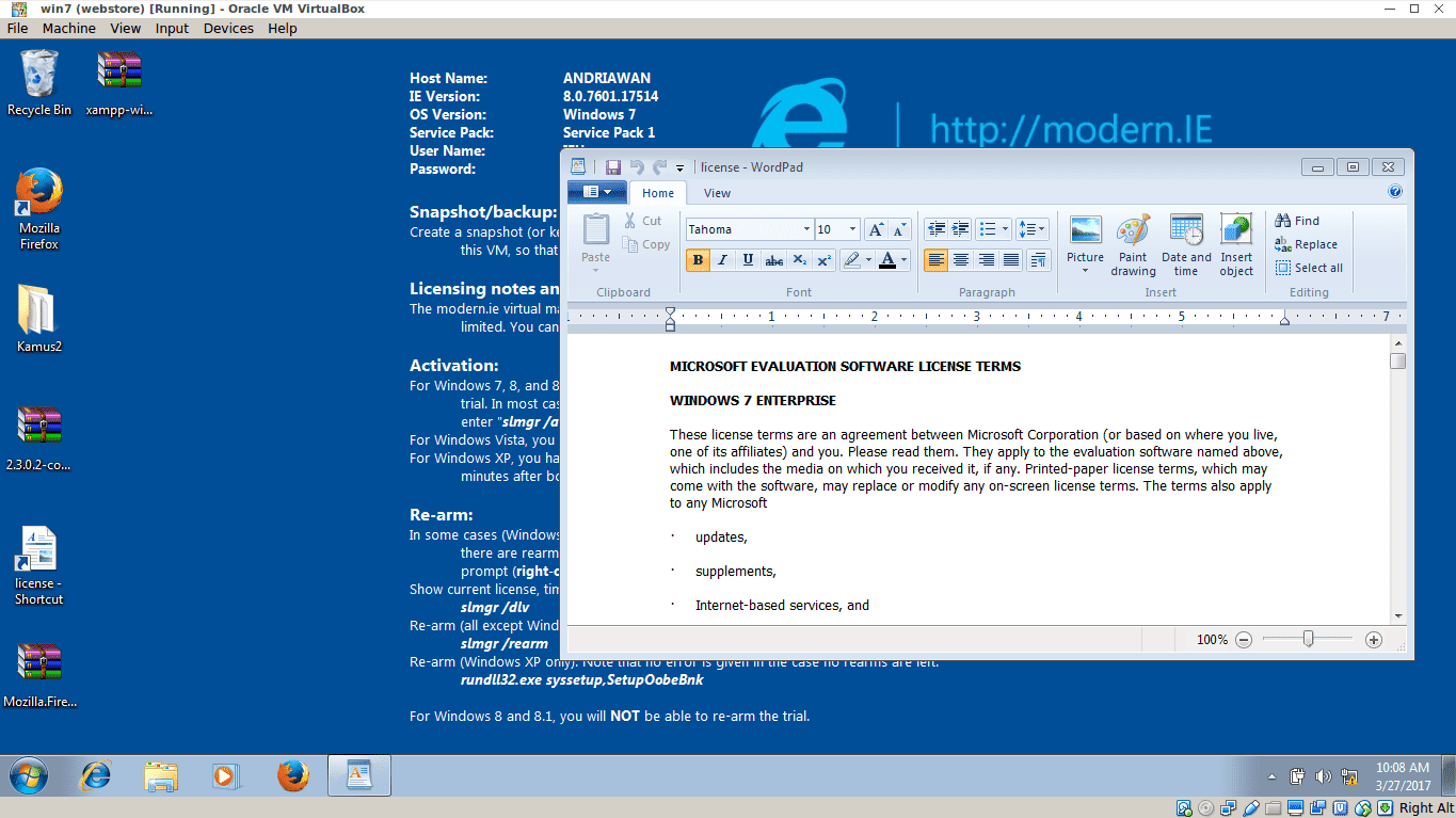 Ternyata memang benar. Virtual Machine Windows 7, 90% sama dengan OS aslinya. setelah masuk Desktop awal, saya melihat ada berkas teks. Berkas tersebut adalah Term and Agreement License. Sejauh yang saya paham Virtual Machine Windows 7 digunakan untuk review saja. Tidak diperkenankan untuk tujuan komersil. Bagi saya itu sudah cukup untuk melakukan eksplorasi jeroan Windows.
