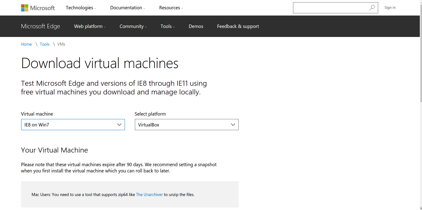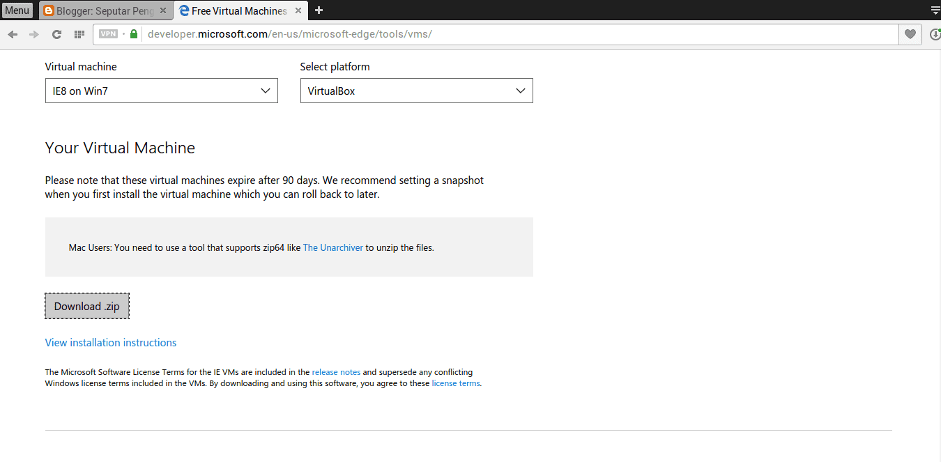 Pihak Microsoft menawarkan virtual machines untuk OS terbaiknya. Awalnya, saya tidak begitu yakin. Namun, saya coba menelusurinya lebih jauh. Ada 2 Dropdown menarik disana. Pengunjung diharuskan memilih Virtual Machine dan Platform. Virtual Machine diteknologi oleh IE. Saya pun memilih IE8 on Win7 dengan Platform Virtualbox. Saya masih tidak percaya Windows OS bisa begitu saja di download walaupun dalam bentuk Virtual Machine.