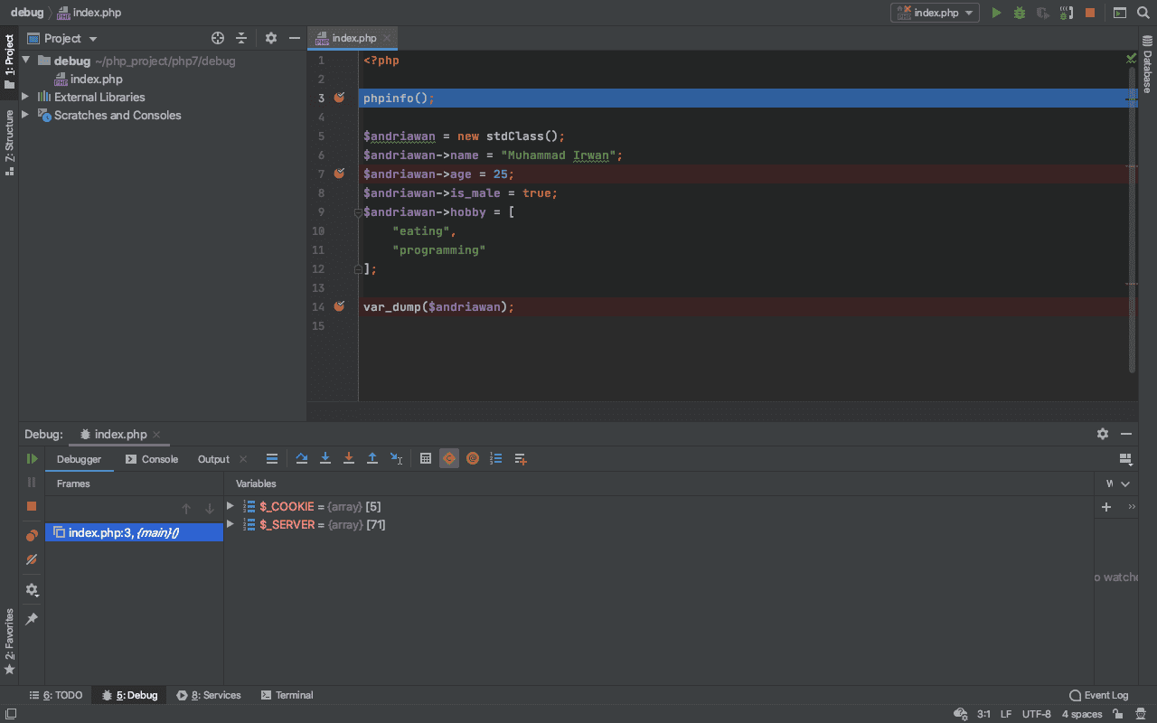 Nah, dari situ Anda akan tau kondisi variable-variable yang ada. Jika Anda perhatikan pada panel bawah, ada beberapa informasi variable Seperti $_SERVER,$_COOKIE. Dengan informasi yang cukup detail seperti ini, pengguna debug var_dump atau manual echo menurut saya sudah ter-cover di sini. Pada tingkat advanced, bahkan Anda bisa menganalisa alur eksekusi kode Framework besar macam Laravel.