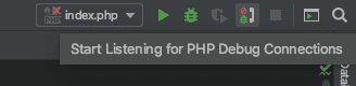 Konfigurasi selesai, Untuk beralih ke mode debug pada PHPStorm IDE, Anda bisa aktifkan pada tombol icon seperti gambar di bawah. Posisinya ada di pojok kanan atas. Menagapa tidak menggunakan debug biasa? karena jika kita memakai mode debug biasa (tombol bericon kutu berwarna hijau) maka kita akan berada pada mode debug per File dan dieksekusi dengan PHP CLI. Pembahasan Debug CLI mode tidak akan dijelaskan detail di sini. Mungkin pada next artikel ya 😁. Kita berfokus pada keseluruhan debugging Aplikasi.