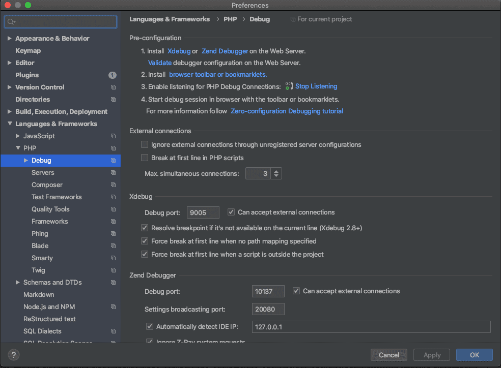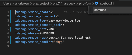 remote_enablemengaktifkan xdebug dalam mode remote. Karena kita menerapkan development berbasis docker Laradock, container service PHP menggunakan php-fpm dalam bentuk container tersendiri. Development kita berada di lokal, jadi kita butuh mengaktifkan remote ke container tersebut.remote_portbeberapa artikel menyarankan port berbeda dengan port yang digunakan php-fpm yaitu 9000 secara defaultnya. Anda bisa mencoba port yang lain. Untuk tutorial ini saya memakai port 9005remote_hostdisini sebenarnya merupakan alamat host lokal kita, untuk case macOS docker memakai nama khususdocker.for.mac.localhost. Untuk kasus lain, penggunaan localhost ataupun 127.0.0.1 dapat digunakan.Penggunaan parameter lainnya anda bisa ikuti yang telah saya tulis di atas. Beberapa memang mungkin tidak diperlukan untuk case tertentu.