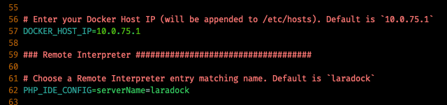 Name untuk based Laradock development menggunakan nama laradock sesuai konfigurasi .env. Anda dapat menemukan konfigurasi ini pada line 62. Jika anda merubah konfigurasi ini, maka Name pada konfigurasi di atas harus diubah juga.