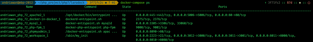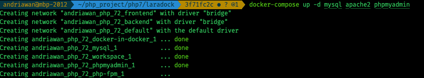 Perintah ini akan melakukan pengecekan apakah container docker sudah ada atau belum pada lokal komputer. Jika belum ada, docker akan mengunduh image yang dibutuhkan kemudian melakukan build sesuai resep Dockerfile yang ada. Jika kita perhatikan, folder Laradock akan berisi banyak folder dengan resep Dockerfile masing-masing. Dalam hal ini, kita hanya memerlukan service mysql, apache2 dan phpmyadmin. Perintah -d akan membuat service container berjalan dilatar belakang dalam mode detach. Pada mode ini, service container akan tetap berjalan dan Anda bisa beraktifitas kembali menggunakan terminal. Tanpa command -d posisi terminal Anda akan terus memantau service container dan jika Anda menekan key ctr + c, container anda Akan berhenti.