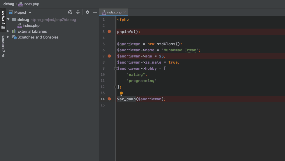 Silahkan Anda coba membuat breakpoint pada file php Anda. Silahkan klik ke sebelah kanan line number. Akan muncul bulatan merah. Nah, itu yang dinamakan breakpoint.
