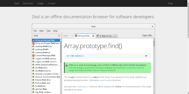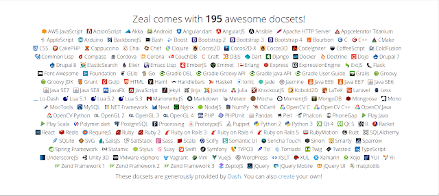 Zeal merupakan tool dokumentasi secara offline. Dengan teknologi docset, Anda bisa menikmati dokumentasi bahasa pemrograman populer dalam satu tempat. Zeal mendukung lebih dari 190 Dokumentasi. Dokumentasi yang disediakan biasanya berbahas inggris disertai dengan tampilan yang fresh.